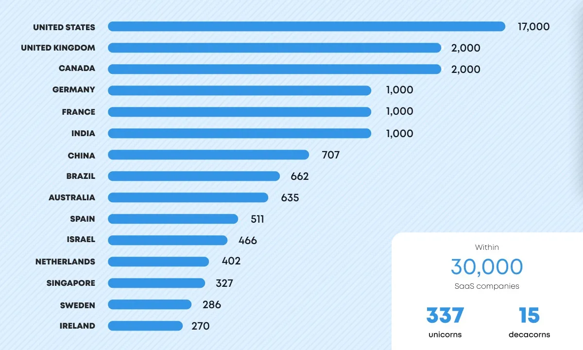 The United States is home to over 17,000 SaaS companies, which makes up roughly 60% of the global SaaS market. This dominance reflects the country’s mature startup ecosystem, abundant venture capital, and strong culture of innovation.