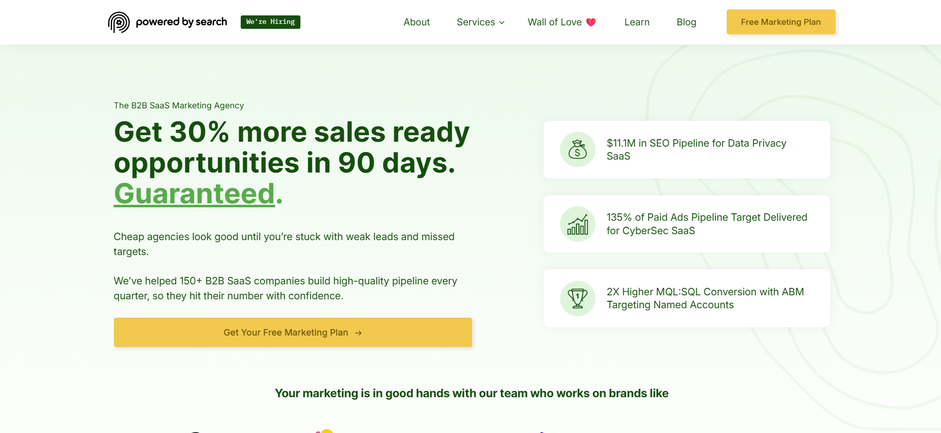 Powered by Search is a B2B SaaS agency focused on demand generation, pipeline growth, and revenue-oriented marketing. Their approach is structured around building more predictable growth systems, which makes them a strong fit for SaaS companies with longer sales cycles and higher pressure on qualified demand.